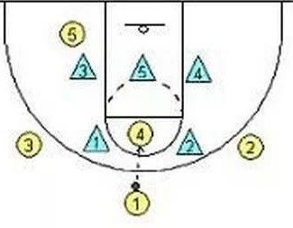 这是“二三联防”最经典的站位:上线二人站在罚球线两顶端至三分线内,下线有两人站在底角三分线以内一到两步,篮下站一人保护篮板,形成了最原始的二三站位。由图可以看出,二三联防属于站位联防,基本盯球而非防人。