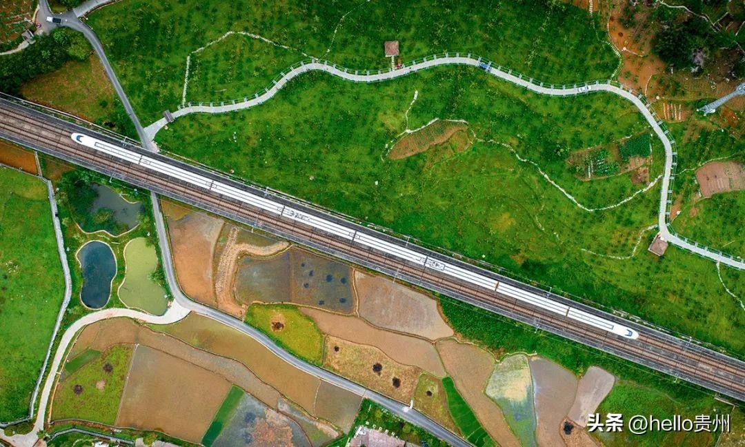 成贵高铁和谐号动车组驶过贵阳市观山湖区朱昌镇长冲村,蜿蜒的乡村公路与笔直的高铁相映成景,美若画卷。贵州日报天眼新闻记者 龙永 摄