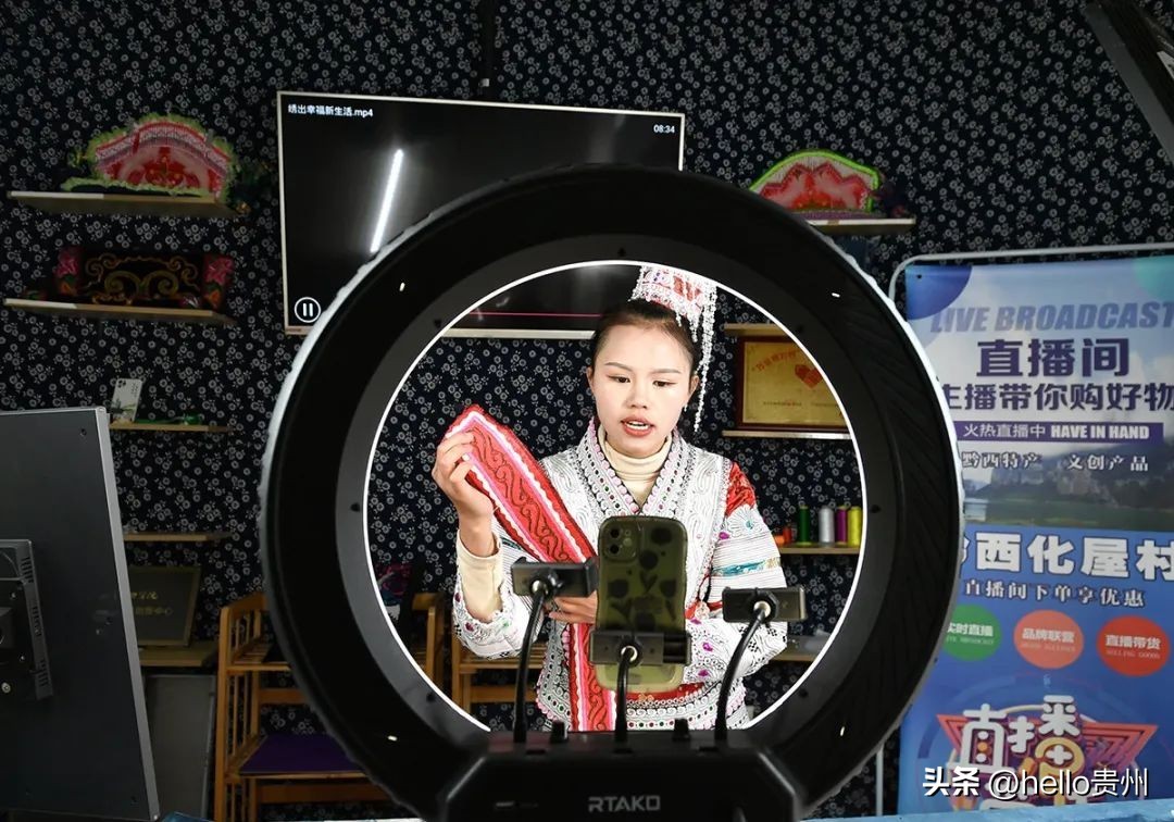 黔西市新仁乡化屋村,一位绣娘通过网络直播推介当地苗绣、蜡染工艺品。贵州日报天眼新闻记者 李森 摄影