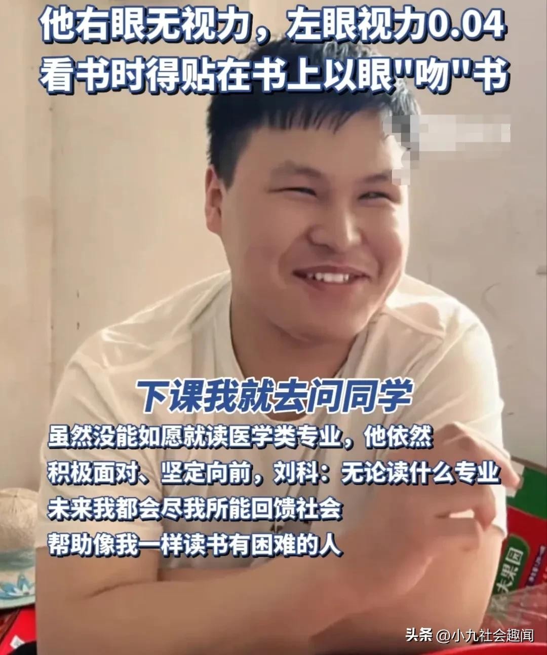 在谈到自己的录取专业时,刘科表示有些遗憾。他坦言自己最喜欢的专业是医学类,但由于视力问题,他未能如愿以偿。然而,他并没有因此消沉。相反,他更加坚定了自己的信念:无论读什么专业,都要努力学习,回报社会。