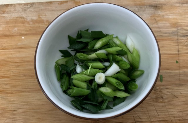 准备蒜苗:蒜苗洗干净后切成小块放入碗中备用;