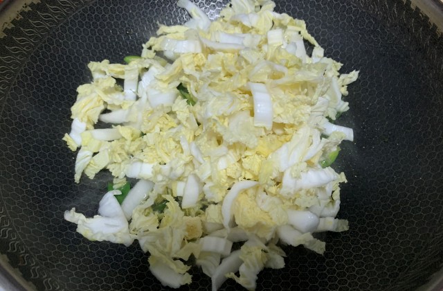 放入辅料:待油烧至稍微冒些青烟的时候将火开至小火(以防辅料炒糊),放入准备好的蒜沫沫、切好的蒜苗、切碎的娃娃菜,然后开至中火进行翻炒;