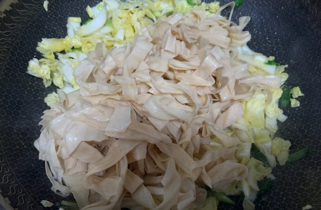 放入蛋白肉:待娃娃菜炒至半熟之后开至大火放入蛋白肉来回翻炒;