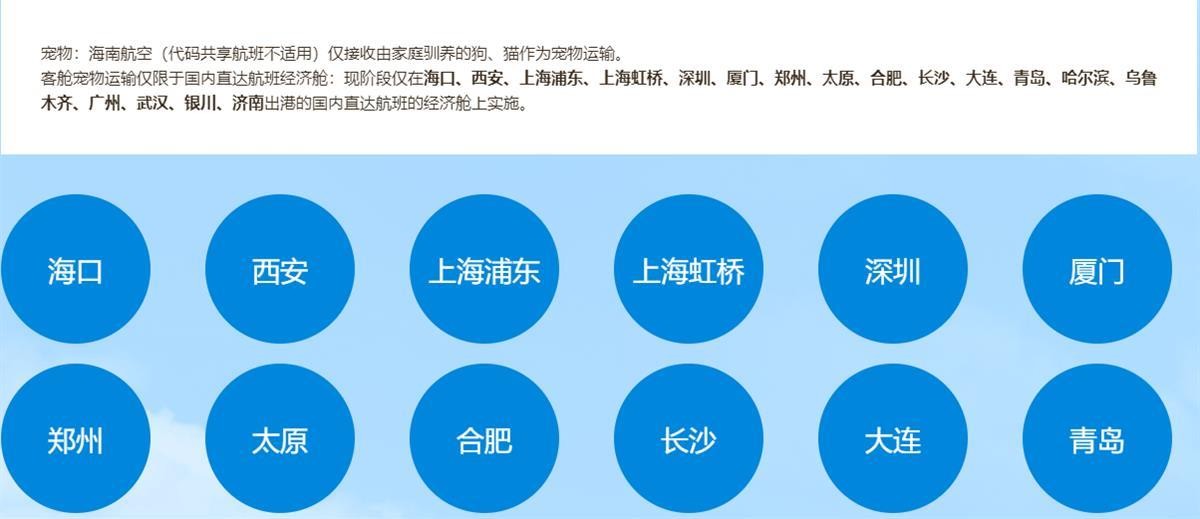 以海南航空的“宠物客舱”服务为例,该服务现阶段仅在海口、西安、上海浦东、上海虹桥、深圳、厦门、郑州、太原、合肥、长沙、大连、青岛、哈尔滨、乌鲁木齐、广州、武汉、银川、济南出港的国内直达航班的经济舱上实施。每名旅客最多可将1只宠物带入客舱,窄体机每个航班最多带入2只宠物,宽体机每个航班最多带入4只宠物。