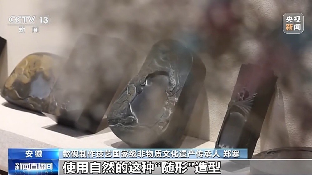 歙砚制作技艺国家级非物质文化遗产传承人 郑寒:现在雕刻倾向于人与自然的和谐,它大部分使用自然的这种“随形”的造型,巧妙设计,体现每一方作品都不相同。