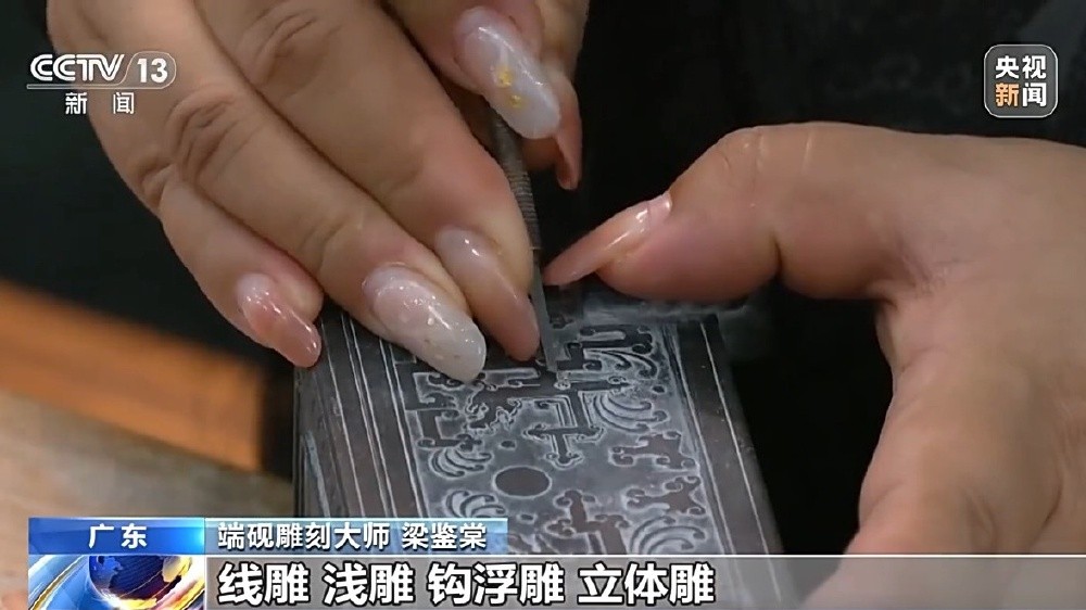 端砚雕刻大师 梁鉴棠:线雕、浅雕、钩浮雕、立体雕,立体雕和浮雕是最高级的艺术技法,因为需要8年至10年的刀工才能掌握。现在端砚不单单是讲究实用,还需要讲究艺术性、收藏性,有一些专门雕刻牡丹,有的做龙、做凤,有的专门做动物、人物,所以端砚发展到现在百花齐放。