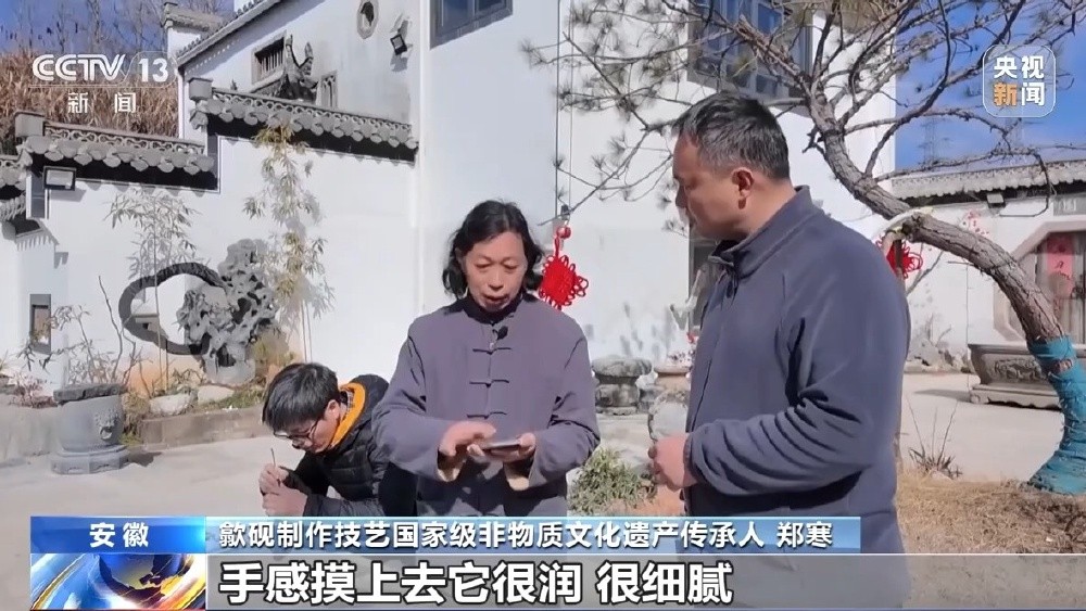 歙砚制作技艺国家级非物质文化遗产传承人 郑寒:手感摸上去它很润、很细腻,但是如果放在高倍的显微镜之下去看,实际上它这种结构是呈菱形的,它是具有一定的锋利性的,所以墨在上面磨的话,它会很容易发墨。