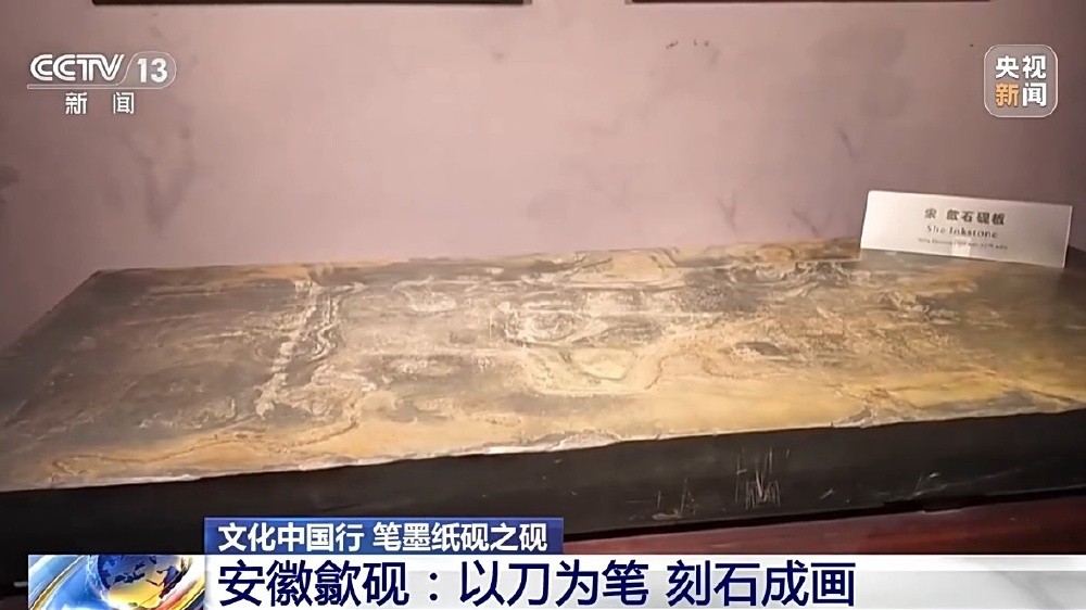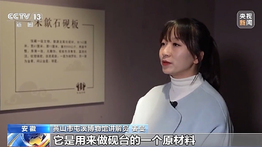 黄山市屯溪博物馆讲解员 姜曼:咱们博物馆里的镇馆之宝是一块宋代的歙石砚板,它是用来做砚台的一个原材料。这块砚板,它两面非常平整,体积特别大,有500多公斤,这块砚板,我们能看到的这一面,它上面全部嵌以金星、银星,很像天上的云霞,所以我们也称它为“金晕”。