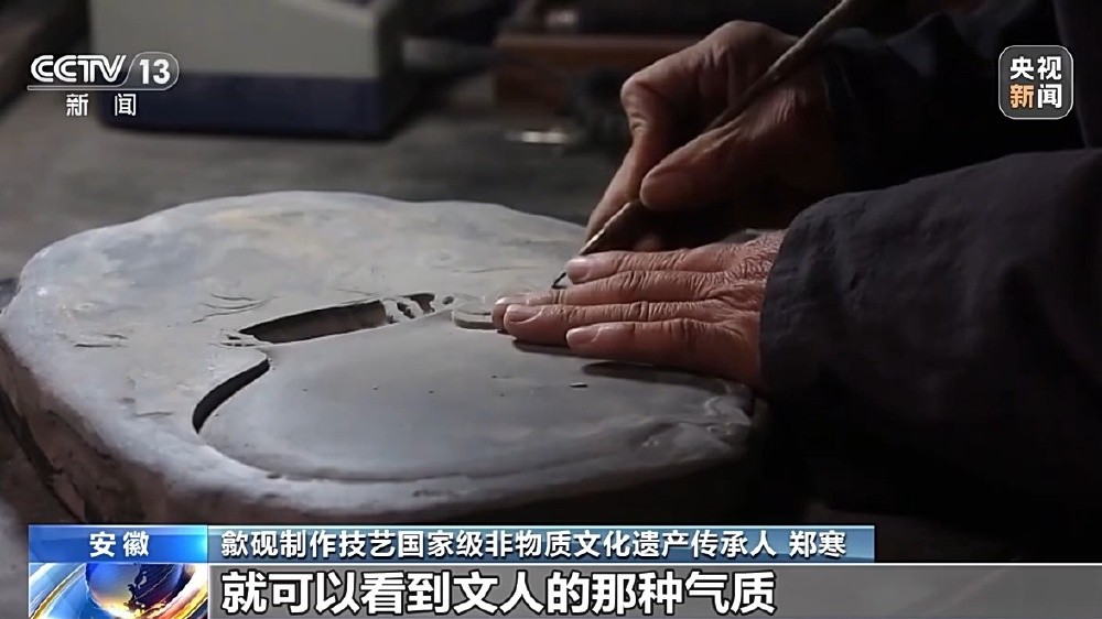 歙砚制作技艺国家级非物质文化遗产传承人 郑寒:歙砚雕刻注重线条,它的线条感非常强,它用不同的刀,圆刀跟平刀相互的穿插运用,把它整个画面活起来。东西做出来以后,就可以看到文人的那种气质,气息比较重、比较浓,这是歙砚的一个最大的特点。