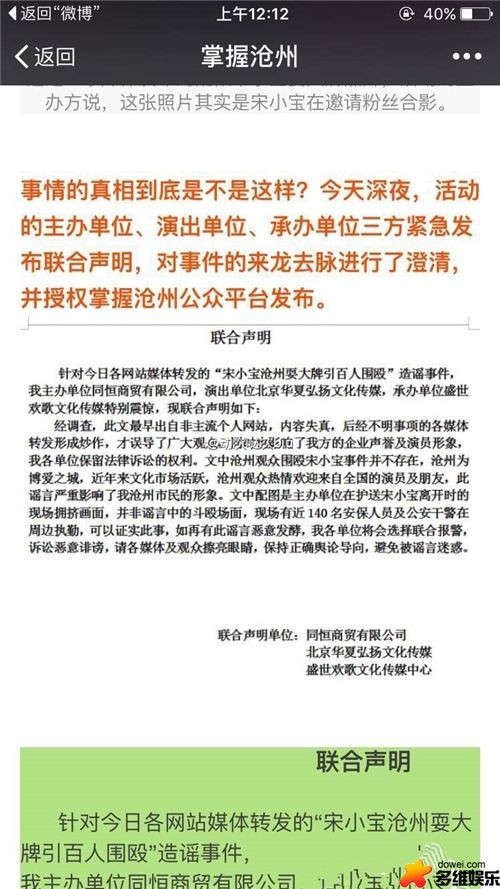 随后,有消息称此事件纯属造谣,当时场景是140多号人早现场维护治安,所配图片是护送宋小宝离开演出现场... ...并称此事为恶意诽谤... ...不过事件到底是真是假,还得等当事人站出来为大家澄清才能有所定夺。