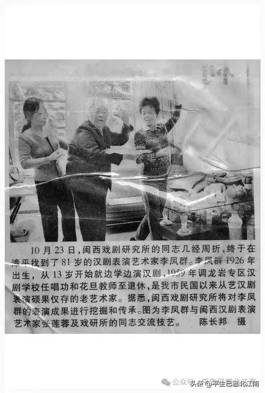 在《福建广东汉剧历史资料初稿》和《新编闽西汉剧史》的资料存在一些差异。首先是名字,采访家人,得知李凤群是本名,李凤琴则是登记户籍和身份证时被误写。因为资料中两个名字交替出现,让人误会是两个人,有必要厘清。其次是出生年月,资料说她出生于1926年,家人则确证她出生于1927年10月。李凤群是连城人,生平最擅长花旦和青衣。由于没有读过书,13岁随父进了龙岩万安人林德坤创办的“新天彩”戏班,向曹锦河、张全镇学习花旦与青衣,台词由师父一句一句教,全靠记忆。