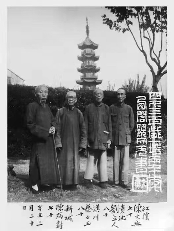 照片右下方陈病树(晚号“西阁长翁”)题词云:“四人三百岁,一塔两千年。西阁题,文无书。”并有“文无”二字图章。照片下空白处另题有:“江阴陈文无,七十;贵池刘立人,八十;汉川蔡子玉,八十;新城陈病树,七十。辛丑三月三十日。”知照片拍摄于1961年,由此可印证陈病树生于1892年,非1894年,询诸陈行健先生,果然。而照片左二的蔡子玉生年当在1882年,卒年至少在1961年后。这张照片的背景为上海龙华塔,郑逸梅《铁线篆圣手陈季鸣》载陈文无(1892-1966,季鸣)与陈病树交往,云“季鸣不蓄须,病树却鬃鬃多髭。一次二人同乘舟作虞山游,一访红豆山庄遗址,舟人误以二人为父子,从此季鸣亦蓄须,俨然为老人了。又一次病树、季鸣与谢冶盦、戴禹修同游龙华,在龙华塔下,合摄一影,禹修题云:‘四人三百岁,一塔两千年。’原来塔建于三国东吴孙权,历年很久了。”(《艺林人物琐记》,西泠印社出版社2021年,276页)记陈病树喜蓄须,确乎是事实,但合影照片与上图不相符。戴克宽(1879-1964,禹修)、谢鼎镕(1878-1960,冶盦)年长于蔡子玉,或陈病树先有此照,后来借用戴克宽题词于上图中。