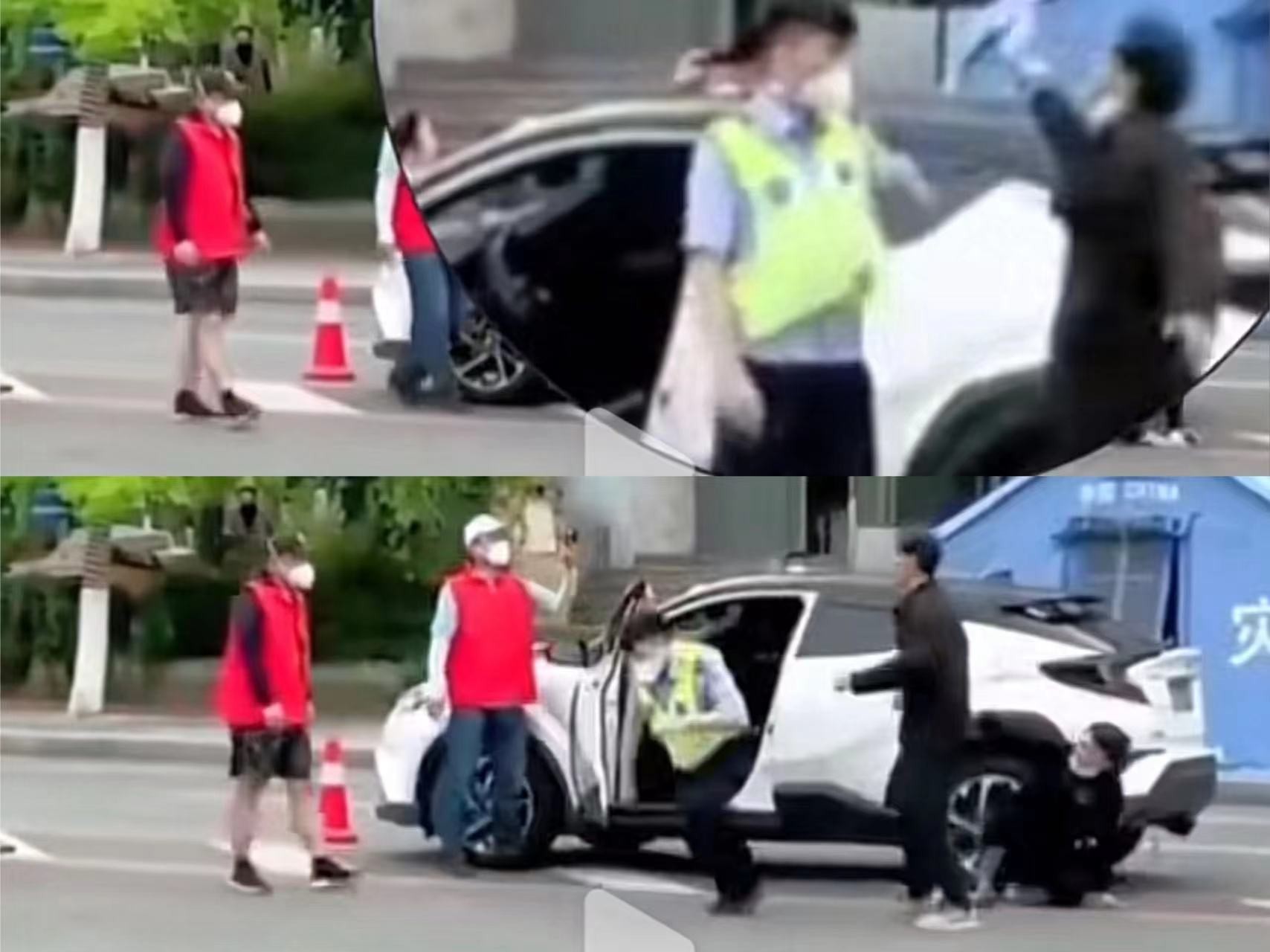 至于网上流传的“父女黄码看病闯卡被拦后袭警”的视频,其实并不是警察,而是一位志愿者。这就是为什么没有戴鸭舌帽和执法记录仪的原因。
