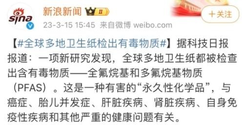 2023年3月15日,《科技日报》刊文报道,美国佛罗里达大学的研究人员发表在《环境科学与技术快报》杂志上的一项研究,对北美、西欧、非洲、中美洲和南美等地方的多个卫生纸品牌进行了调查,结果很多卫生纸都被检查出一种叫全氟烷基和多氟烷基的有毒物质。
