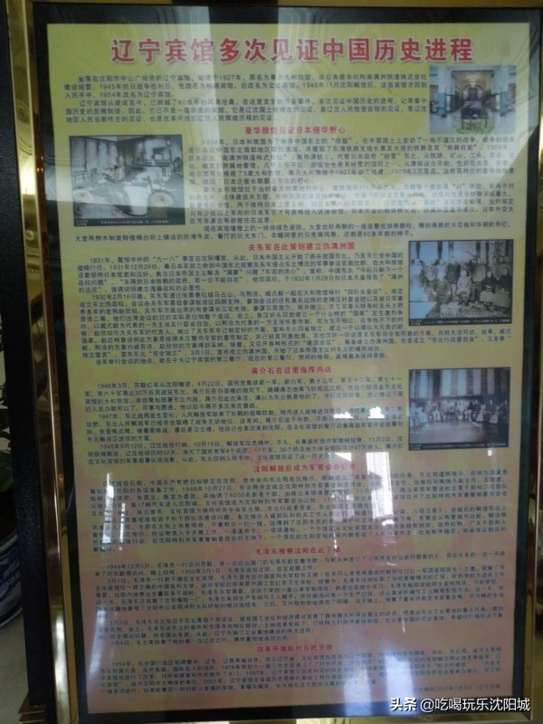 当时这家旅馆是奉天城最大、最豪华的旅馆,专门接待日本上层人物,如日本国内的军政要人、达官显贵、“满铁”及军方首脑,还规定只有少佐以上军衔的日本军官才有资格入住这家旅馆。 日本天皇的胞弟秩父宫、伪满洲国皇帝溥仪、 日本外交大臣芳泽谦吉等都曾住在这里。辽宁宾馆墙壁上的一块块绿色的瓷砖,大堂台阶两侧的一座座欧式拱券廊柱,雕刻典雅的天花板和华丽的吊灯,大堂两侧木制旋转楼梯台阶上铺设的防滑牛皮,餐厅的巨大木门、衣帽间里的贝壳屏风等还都保留着80多年前的样子,唯一不同的是,新中国的人民已经成为它的主人。关东军在这里策划建立伪满洲国1931年,震惊中外的九一八事变在沈阳爆发。