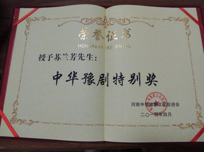 2014年4月10日晚,“千树万树梨花开——第三届中国豫剧节闭幕式暨颁奖晚会”在河南电视台1500平方米演播厅举行。苏兰芳先生荣获“中华豫剧特别奖”,河南省政协原秘书长、河南中华豫剧文化促进会副会长兼秘书长张秉义为苏兰芳先生颁奖。