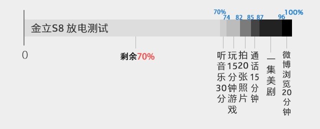 通过上面一套放电测试,我们对金立S8的续航表现可以有初步认识。测试完最终剩余电量在70%,与目前大多Android机型相近甚至还稍强。耗电较明显的地方集中在了看视频、玩游戏两项上面。