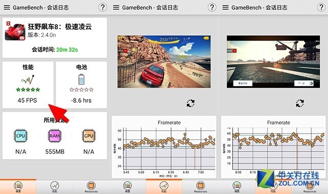 开启帧数记录App后,我先玩儿了20分钟狂野飙车8,期间跑完六场竞速。帧数记录软件测得游戏期间平均帧数为45FPS,打开详细数据可见游戏过程中大部分时候帧数会在40-50FPS之间浮动,菜单界面会保持在50FPS以上,整体游戏过程十分流畅。