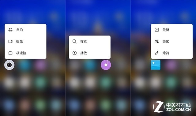 金立S8具备3DTouch的屏幕能够区分用户指尖的触碰和按压,例如在桌面按压相机App,就会弹出自拍、摄像、极速拍三个选项,想自拍不需要先打开相机再选择自拍了;按压桌面的音乐App,此时又会弹出搜索、播放;按压时钟App则会弹出新建闹钟、计时器、秒表。对于一些不支持压感快捷菜单的App如第三方App,则会伴随着“动感壁纸”的动态效果给予用户一个振动反馈。
