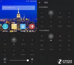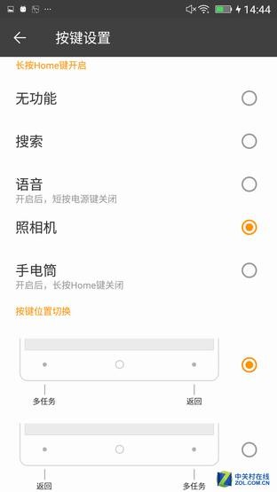 机身正面底部是一颗按压式指纹识别HOME键,左右分别为多任务和返回键。为了照顾不同用户的使用习惯,左右两键所实现的功能是可以对调的。另外,在设置中你同样能找到长按HOME键实现的功能,包括无功能、搜索、语音、照相机、手电。这里我将长按HOME键设置成了启动照相机,当需要拍照时从兜中拿出手机的同时即可长按启动相机,很方便。