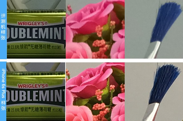 样张细节对比中,金立S8与iPhone对焦点均选择口香糖盒。可见解析力方面二者不相上下,文字均可轻松辨识。但在画面边缘的花朵、笔刷细节上,金立S8的样张表现并没有iPhone清晰,看来在画面边缘部分有解析力下降的情况出现。