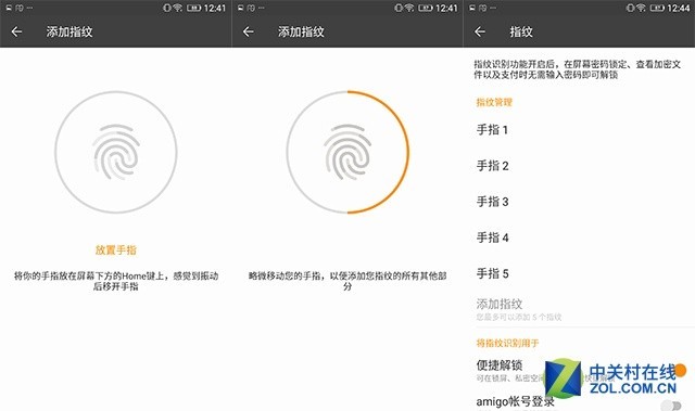 金立S8正面指纹识别HOME键最多可录入5个不同指纹,录入过程需要不断变换姿势,大约8次左右可录入完毕。平时使用几乎可以达到“任何”姿势按在上面都可以完成解锁的效果,甚至手指倾斜一些使用侧面都能解锁S8,并且识别速度相当快。