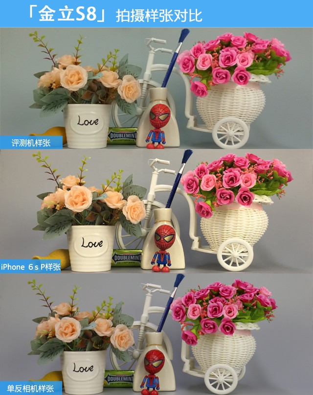 从拍照台整体样张中,我们看到金立S8物体在白平衡表现上比iPhone稍弱,iPhone的白平衡更接近真实场景(单反样张)。不过曝光控制上金立S8却比iPhone要准确得多,对比图中可见花盆颜色、蜘蛛侠、笔刷的颜色与真实场景更接近。