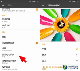 金立S8还具备“屏幕省电”功能,可根据屏幕显示内容自动调节亮度。另外在设置中为用户提供了色彩模式调节,用户可在中性、冷色、暖色之间进行切换。例如临睡觉可以将屏幕色调切换至暖色,降低蓝光对眼睛的刺激有助睡眠。