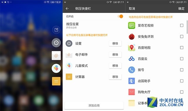 任何界面下,你还可以通过在屏幕右边缘先按压、再滑动,呼出侧边快捷栏。你可以将平时高频使用的App放在这里,通过一按、一滑快速启动。例如我将计算器放在了这里,需要计算时不用再到处翻找计算器App了。