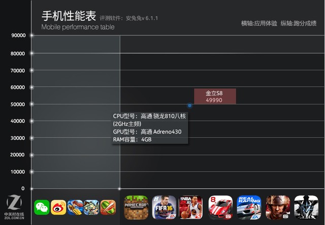 使用安兔兔v6.1.1测得金立S8综合得分为49990分,处于Android阵营中间位置。光看跑分不能说明问题,所以我们还要通过实际体验来考察金立S8的性能。这里我选择了两款游戏进行体验,分别是《狂野飙车8》和《神庙逃亡2》: