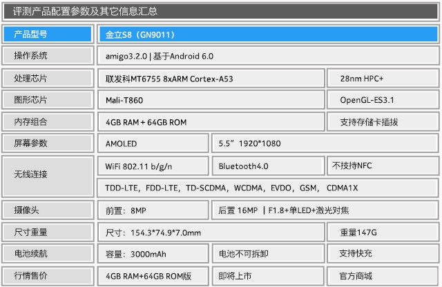 总结:金立S8作为主攻中高端市场新旗舰,在硬件配置上面已经具有与其他名厂旗舰竞争的实力。处理器选择上金立并没有采用“发烧级”顶级芯片,但MT6755对于大部分用户已经足够,即便是大型3D游戏体验也相当出色。相机方面配备了高达1600万像素主摄像头,整体素质接近iPhone 6s Plus,夜景表现十分优异。另外,还采用了少见的前置800万像素,喜欢自拍的用户不要错过。