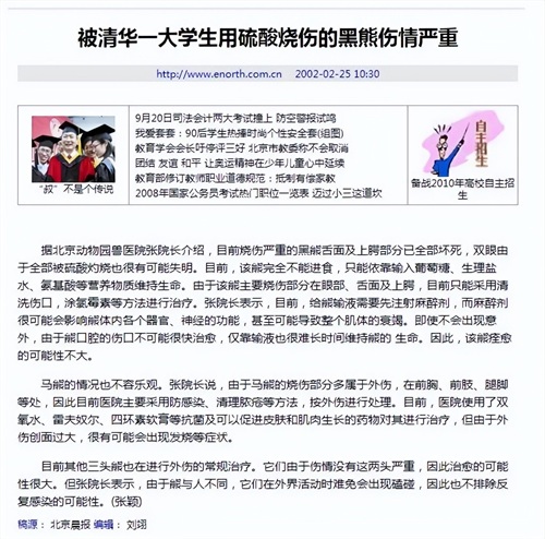 2002年,清华大学电机系学生刘海洋因先后多次用浓硫酸和氢氧化钠烧伤北京动物园熊山的三只黑熊而被刑事拘留。此事件引起了广泛的社会关注,尤其在学术界和媒体中,引发了关于道德教育、法律责任与社会责任的广泛讨论。