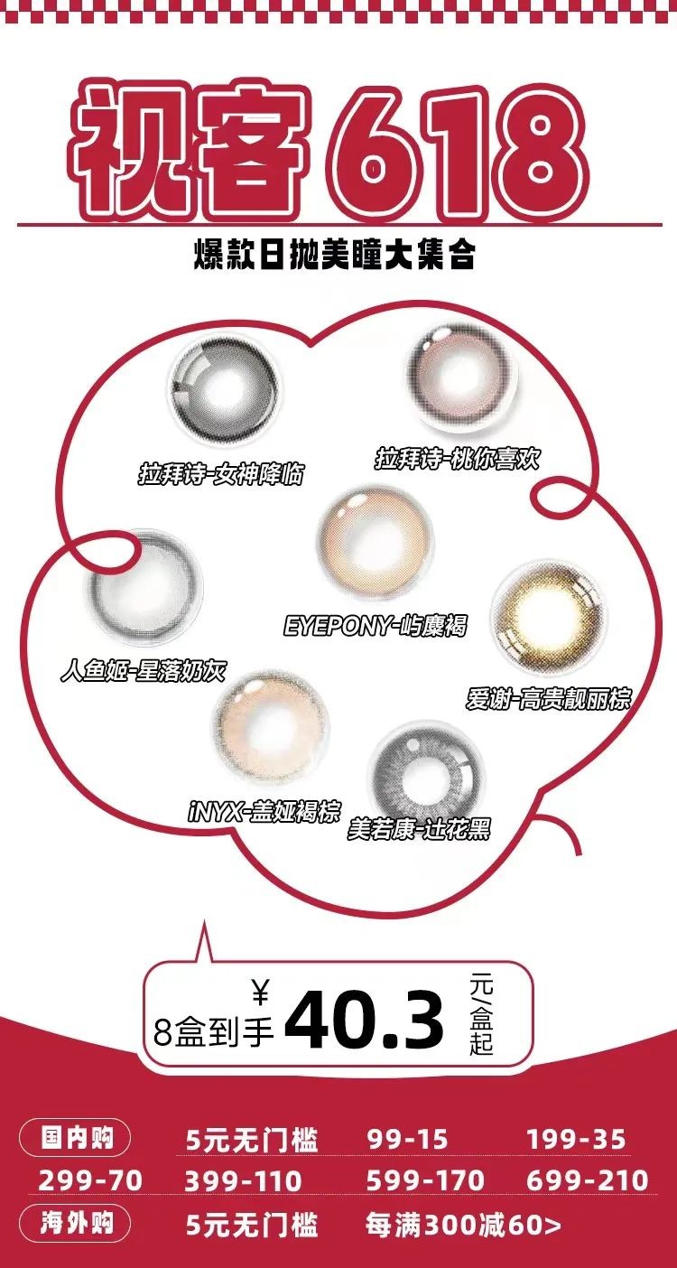 这次的6.18大促,视客眼镜网的价格极具诚意,正是为下半年囤货的绝佳时机!从5月20号到6月20号,“国内购”凡是下单即有5元无门槛抵用券,另有“99减15、199减35、299减70、399减110、599减170、699减210”的满减活动;"海淘购“”除了5元无门槛抵用券外,还享每满300就减60!热销款美瞳券后到手价更是低至40.3元/盒。