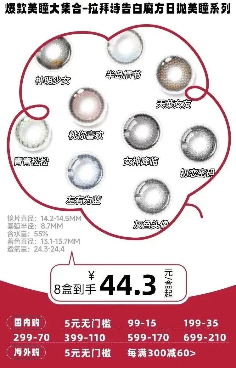 想要拥有水光瞳,拉拜诗告白魔方「小方盒」日抛系列绝对是首推!「小方盒」系列美瞳花色由原创设计师独家特调,更能增加“眼神光”,让你明眸传情,用眼神告白,拥有一双会说话的眼睛!