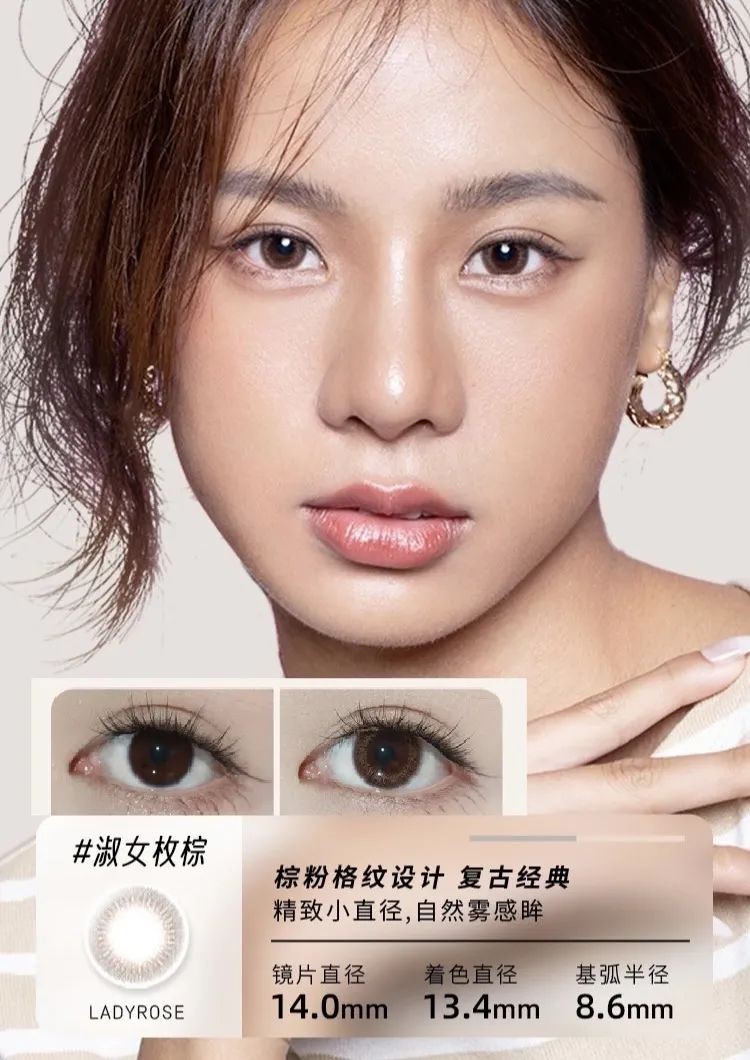 「淑女玫棕」这款粉色低调又复古,显色非常自然,特别适合想要初尝粉色美瞳的仙女!在稍稍改善瞳孔颜色的同时,又给眼睛打造出伪素颜般的剔透水光感,日常又百搭!