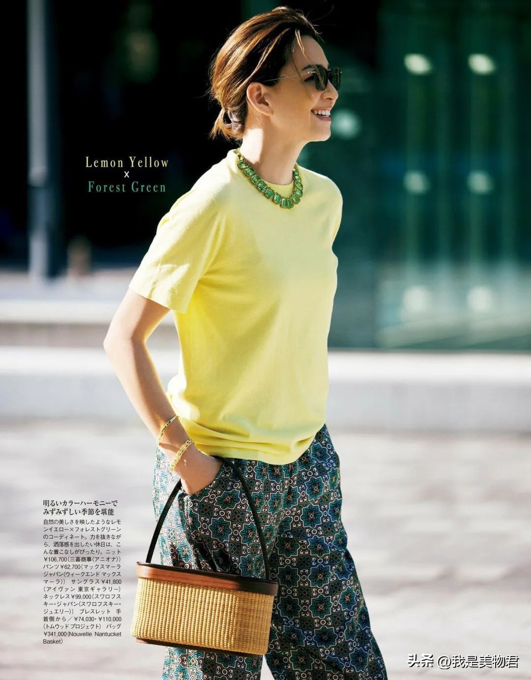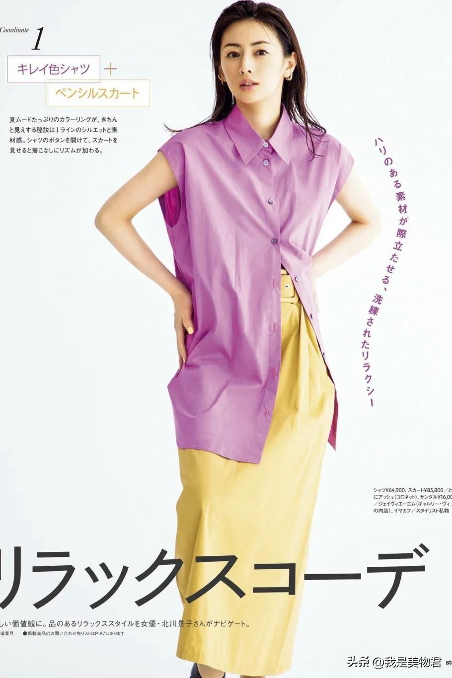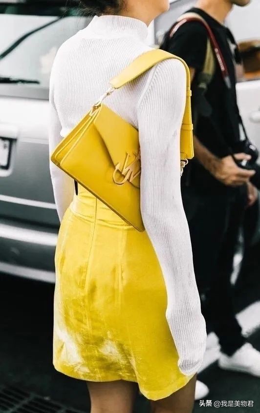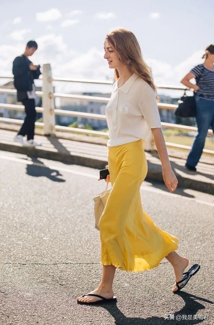 只是过分抢眼的饱和度,用在靠近脸部的位置,在夏季难免显得很热。为了清凉度考虑,最好把黄色用在下半身,稳妥又显白。