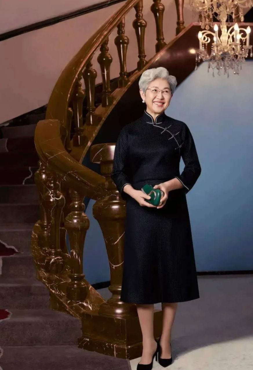 穿西装不能过于古板守旧,要适当地融入时髦的手法很重要,特别是到了奶奶辈儿的年纪,懂得穿搭技巧更显气质,像傅莹这一套蓝色旗袍衫配深蓝色西服套装,就采用了同色系手法,舒适又大气。
