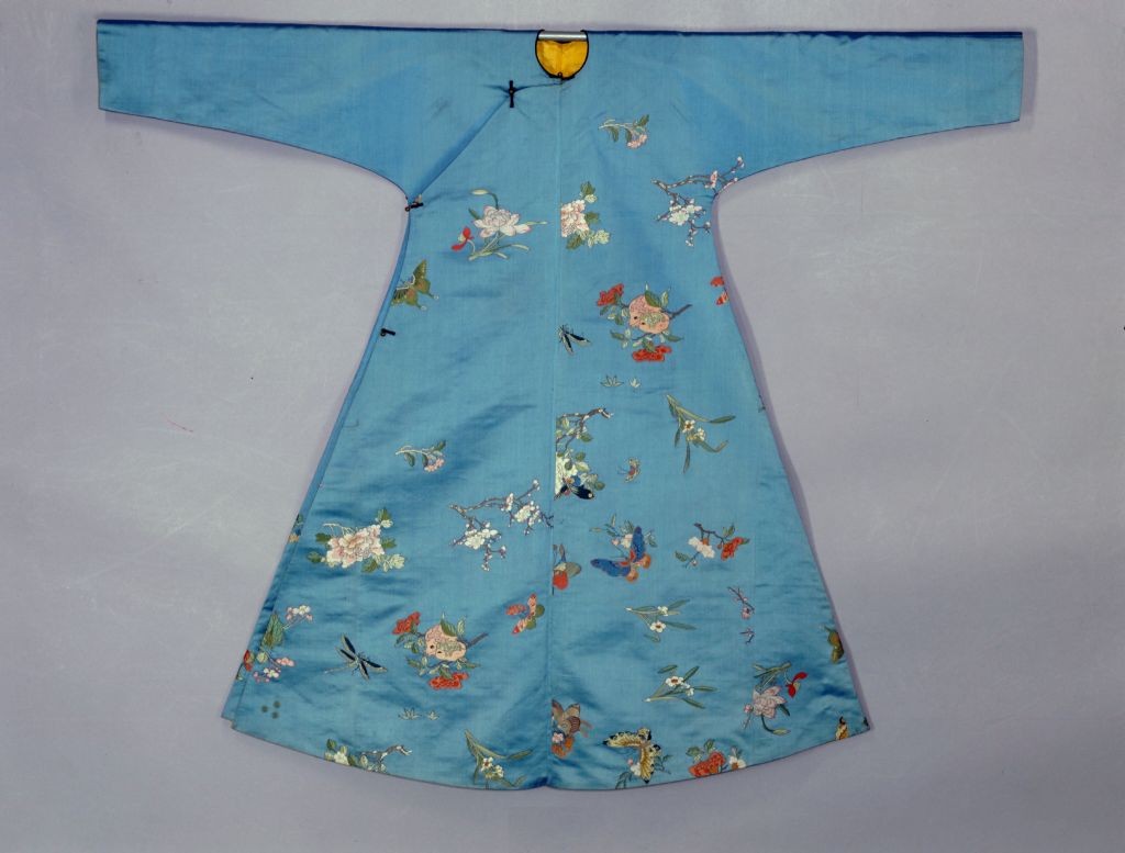 图4、清乾隆 月白缎织彩百花飞蝶袷袍