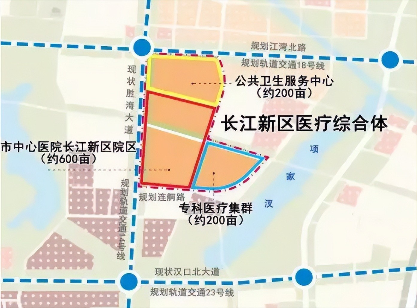 据了解,长江新区医疗综合体位于长江新区项家汊湖以东、泵站河以西、汉口北大道以北、南侧紧邻规划轨道交通23号线。