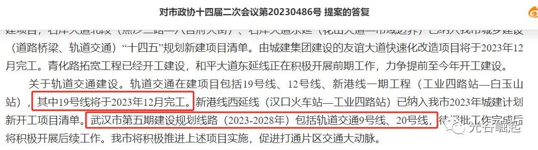 轨道交通在建项目包括19号线、12号线、新港线一期工程(工业四路站—白玉山站),其中19号线将于2023年12月完工。新港线西延线(汉口火车站—工业四路站)已纳入我市2023年城建计划新开工项目清单。武汉市第五期建设规划线路(2023-2028年)包括轨道交通9号线、20号线,待报批工作完成后将积极开展后续工作。我市将积极推进上述项目实施,促进打通片区交通大动脉。