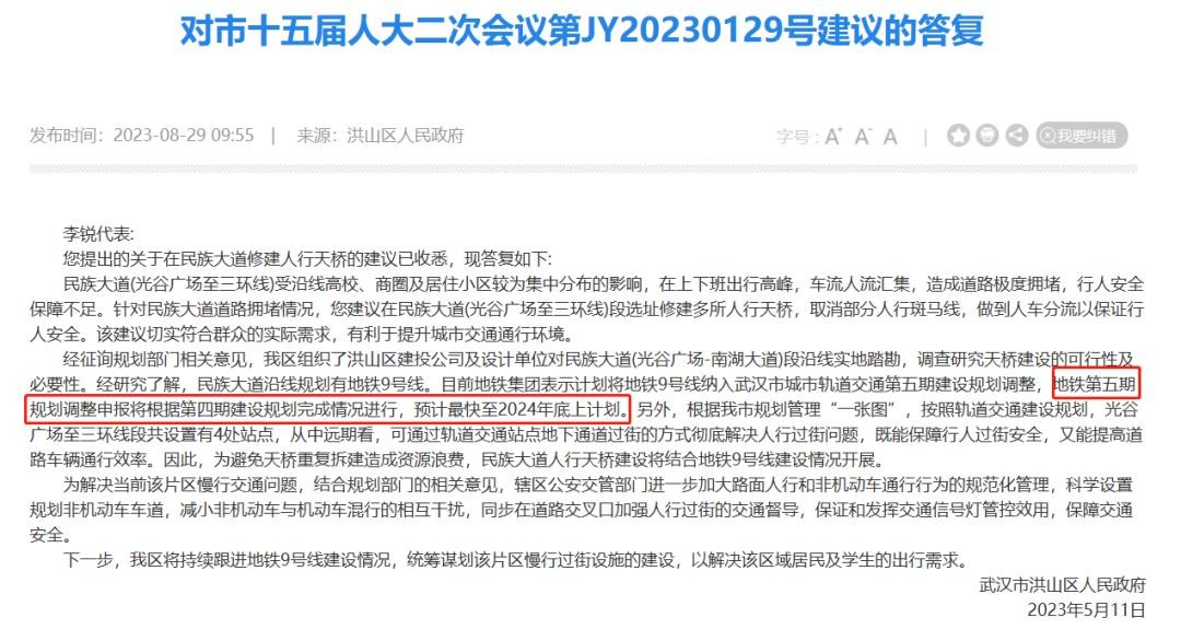 8月29日,洪山区相关回复显示,目前地铁集团表示计划将地铁9号线纳入武汉市城市轨道交通第五期建设规划调整,地铁第五期规划调整申报将根据第四期建设规划完成情况进行,预计最快至2024年底上计划。
