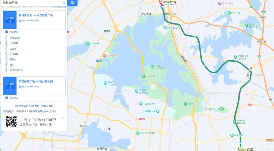 根据百度地图显示,19号线共包含7站,分别是新月溪公园、光谷五路、花山河、花山新城、鼓架山、武东及武汉站西广场,首末车发车时间分别是早上7点和晚上9点。