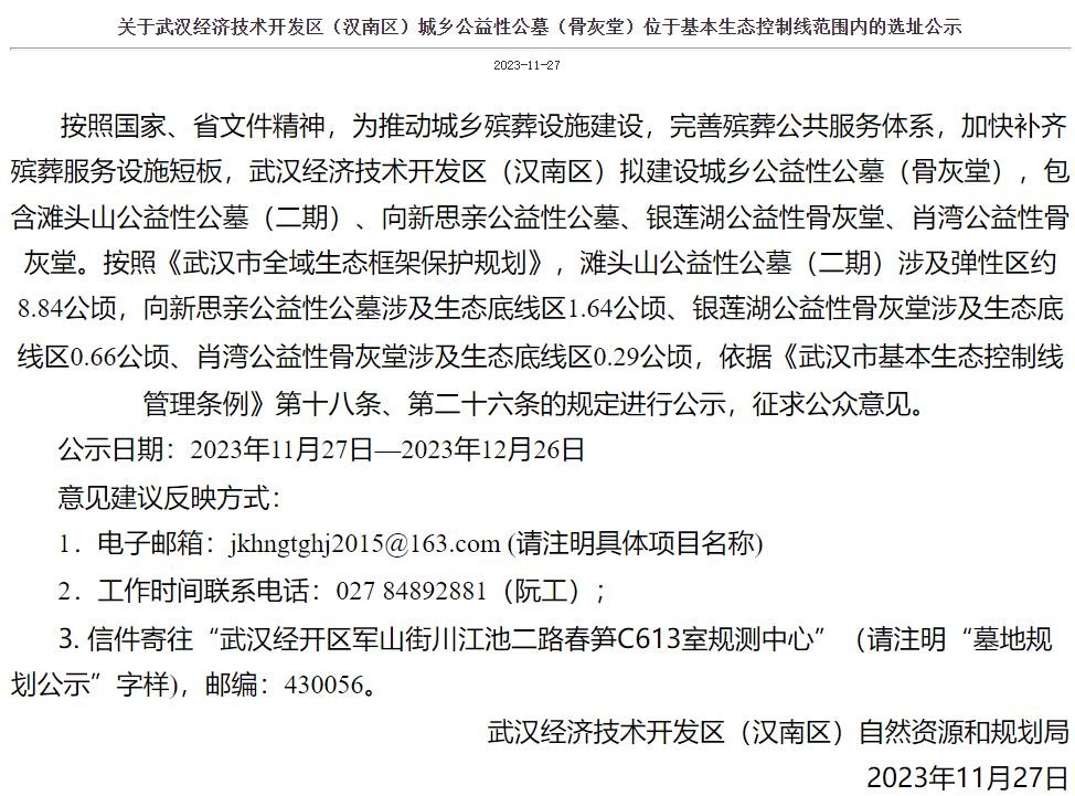 根据公示内容显示,武汉经济技术开发区(汉南区)拟建设城乡公益性公墓(骨灰堂),包含滩头山公益性公墓(二期)、向新思亲公益性公墓、银莲湖公益性骨灰堂、肖湾公益性骨灰堂。