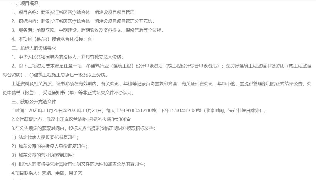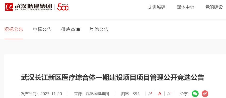 11月20日,武汉城建集团发布了武汉长江新区医疗综合体一期建设项目管理公开竞选公告。