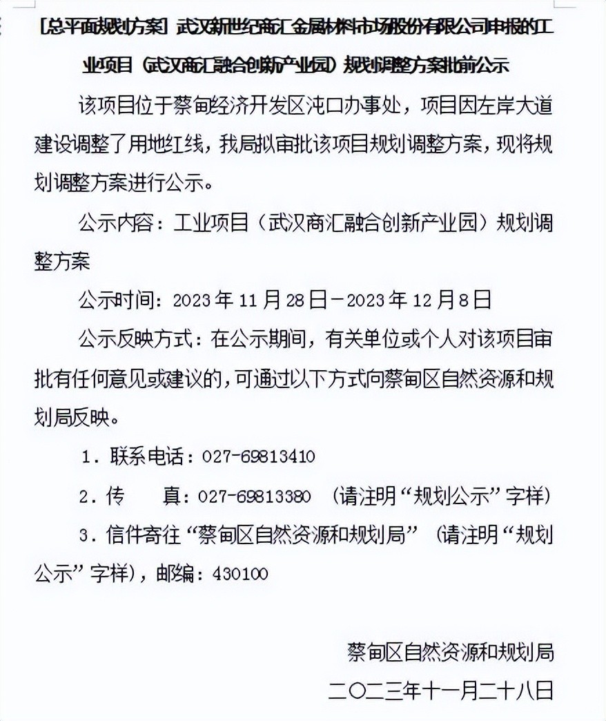 11月28日,蔡甸区规划局公示了武汉新世纪商汇金属材料市场股份有限公司申报的武汉商汇融合创新产业园规划调整方案。