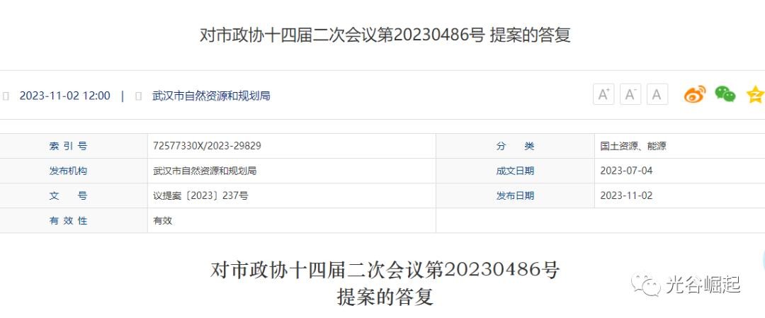 2023年11月,武汉市自然资源和规划局发布了“对市政协十四届二次会议第20230486号提案的答复”。