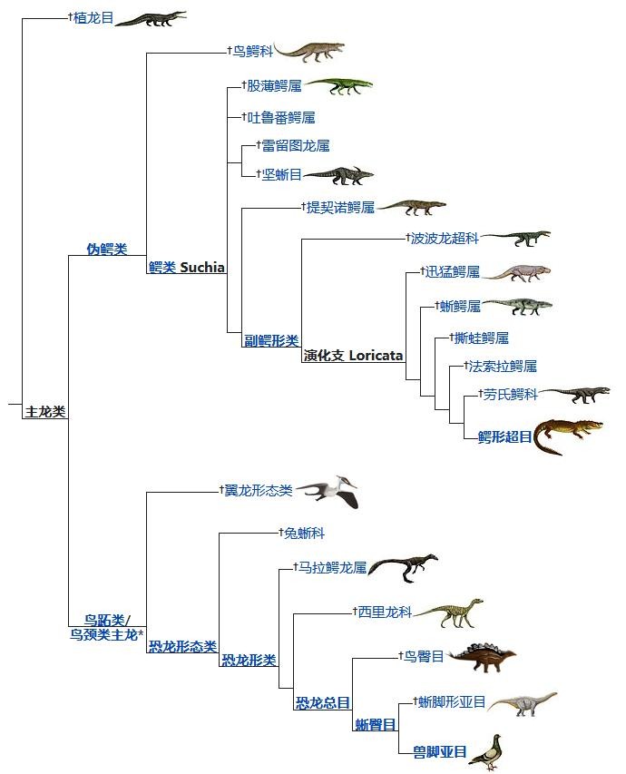 槽齿目是个原始主龙类的并系群集合,也被视为恐龙、翼龙、鳄鱼的共同祖先和三叠纪时期的霸主,但这个分类目前已过时而被淘汰。槽齿目的定义是特定的共同原始特征,例如:眶前孔(一对在头骨两旁介于眼窝与鼻孔间的洞)与位在槽洞里的牙齿。槽齿指的是槽齿目的牙齿都位在颌骨的槽洞中;这是一个主龙类的特征,而恐龙仍保有这个特征。由于这个并系群内的亲缘关系较为复杂,目前已不再简单地视为一类。槽齿类中从二叠纪末开始出现的最原始的古鳄科再到三叠纪晚期的劳氏鳄、波波龙等只能根据具体的亲缘关系划分在主龙形类和主龙类演化支系的不同位置。槽齿类中与鳄鱼关系较近的部分直接划为伪鳄类,伪鳄类是三叠纪晚期最主要的统治者。