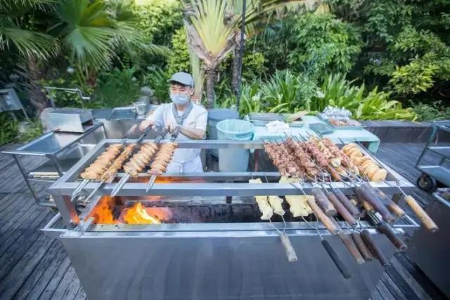 酒店餐饮以海南特色菜为主,每日必开的园林内的海鲜自助烧烤晚餐是酒店一大特色餐饮。每晚,特色池畔池畔都有木排烧烤晚宴,一边听着乐队伴奏,一边欣赏椰风海韵,惬意非常。