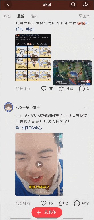 比如在KPL赛事的话题下,你既能看到官方资讯,也有解说的现场互动、记录,主播的分析解读,还有粉丝的二创、玩梗、吃瓜。甚至因为大多数战队、选手都入驻了小红书,看着比赛,还能跳转到战队、选手的主页,看到不少幕后信息。