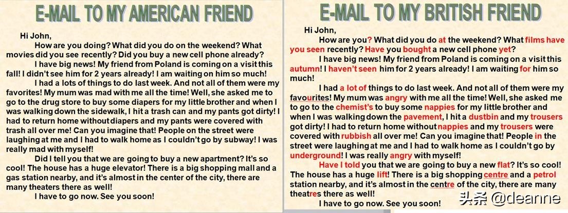最后放一张网上找到的英式英语与美式英语的一个书信案例的对比给大家参考总结。